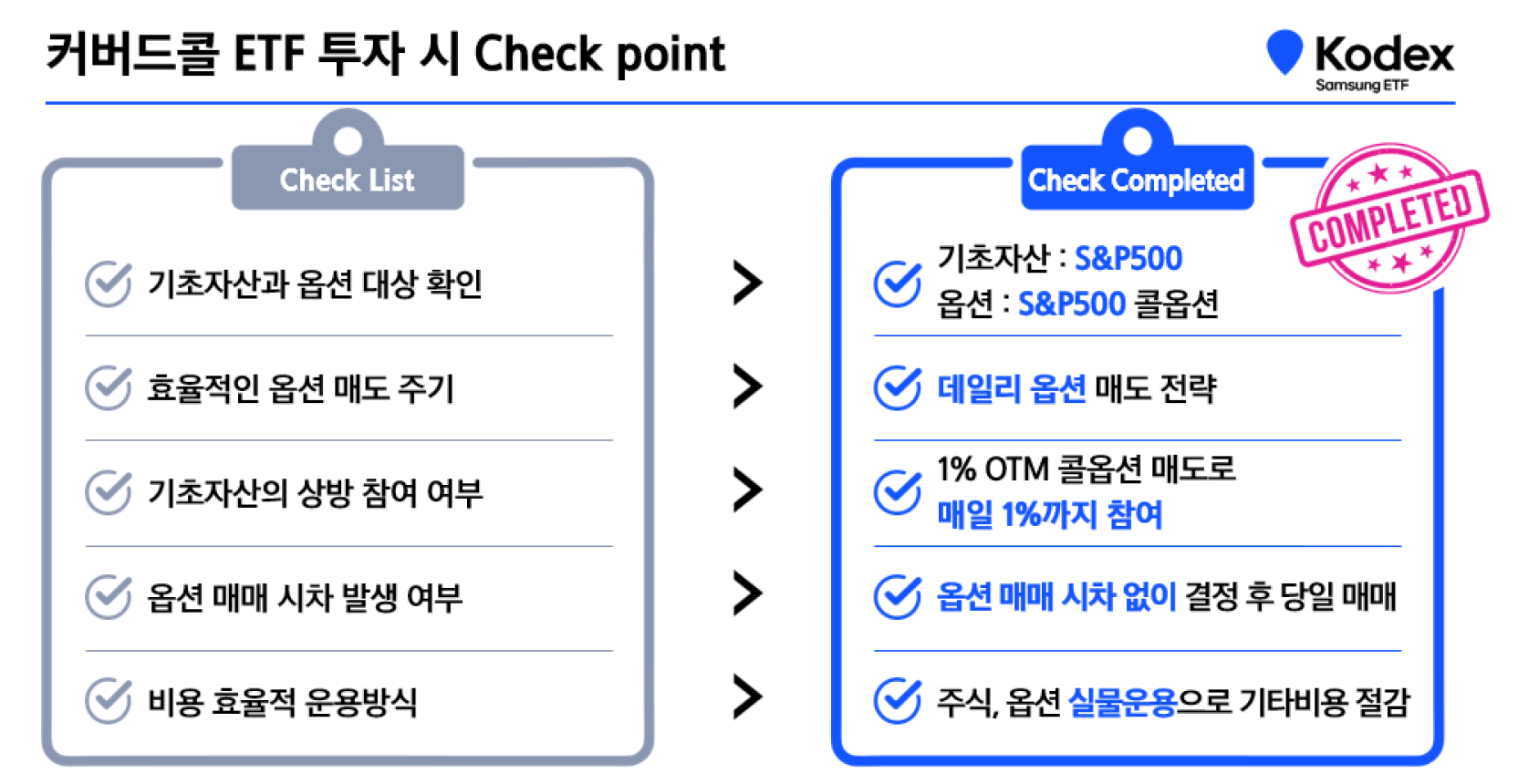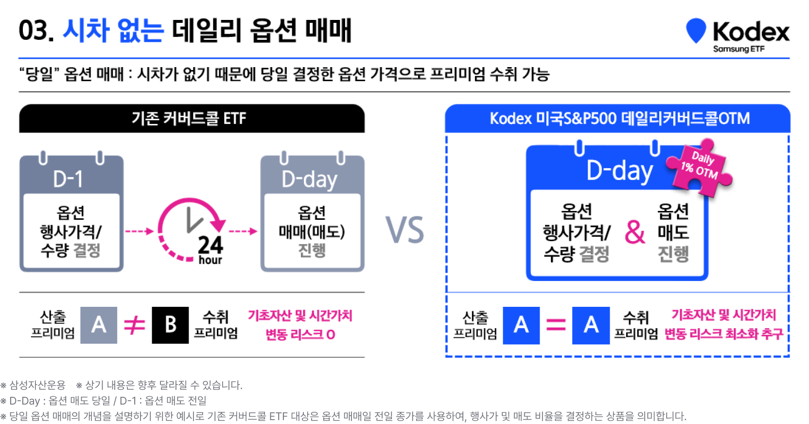 기존 커버드콜 ETF와 비교했을 때, Kodex 미국S&P500데일리커버드콜OTM ETF의 장점이 또 하나 있습니다. 바로 “시차 없는” 당일 옵션 매매가 가능하다는 점입니다. 기존 커버드콜 거래의 경우, 옵션 행사가격 및 수량과 옵션 매매(매도) 간의 시차가 발생하기 때문에 기초자산 변동에 노출됩니다. 산출 프리미엄과 수취 프리미엄 간의 차이가 발생할 수밖에 없는데요, Kodex 미국S&P500데일리커버드콜OTM ETF의 경우 미국의 뉴욕현지법인에 옵션 매매를 위탁하여 운용하기 때문에 이러한 리스크를 최소화할 수 있습니다. 옵션 행사가격 및 수량이 결정된 당일에 옵션 매도 진행을 하기 때문에 시차에 따른 변동 리스크를 줄일 수 있는 것이죠.