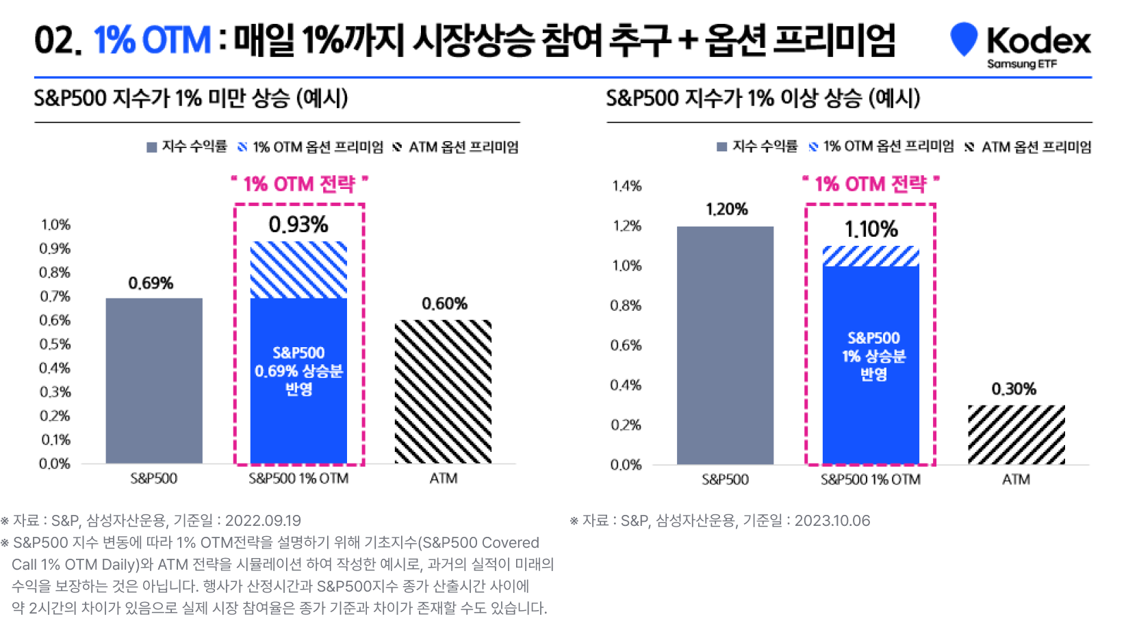 Kodex 미국S&P500데일리커버드콜OTM ETF라는 상품명에서 OTM이란 무슨 뜻일까요? 예시를 통해 알아보도록 하겠습니다. S&P500 지수가 1%미만으로 상승하거나 하락할 때는 지수 수익률만큼 따라가고, 추가로 옵션 프리미엄을 수취할 수 있습니다. 그렇다면 만약 최근 몇 달처럼 S&P500 지수의 상승률이 1% 이상일 때는 어떻게 될까요? Kodex 미국S&P500데일리커버드콜OTM ETF는 S&P500 지수의 상승을 1%까지 참여하고 옵션 프리미엄을 수취하는 전략 을 활용하게 됩니다. 따라서, 1% OTM 전략이란 미국 S&P500 지수 1% OTM(Out of the Money)에 해당하는 행사가 옵션을 매도하여 매일 1%까지 시장 상승 및 변동에 참여하고, 프리미엄까지 수취하는 전략입니다.