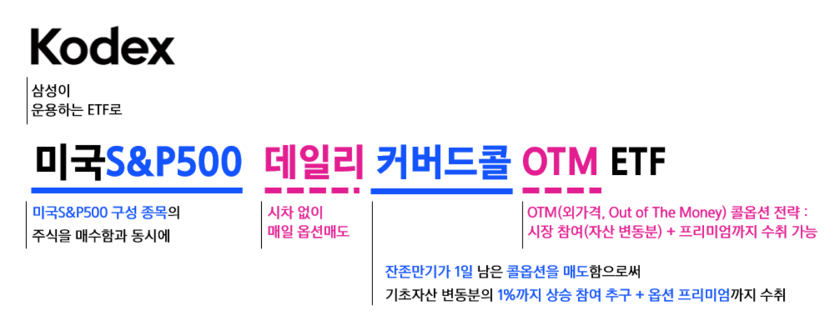 Kodex 미국S&P500데일리커버드콜OTM ETF는 삼성자산운용 Kodex가 운용하는 ETF로, 미국S&P500 구성종목에 투자하면서 매일 옵션 거래를 통해 프리미엄을 수취하는 ETF입니다. 잔존만기가 1일 남은 콜옵션을 매도하며 OTM(외가격, Out of The Money) 전략을 통해 기초자산의 변동에 따라 1%까지 시장의 상승에 참여하는 것을 추구하고, 옵션 프리미엄까지 수취하여 배당 자원으로 활용합니다.