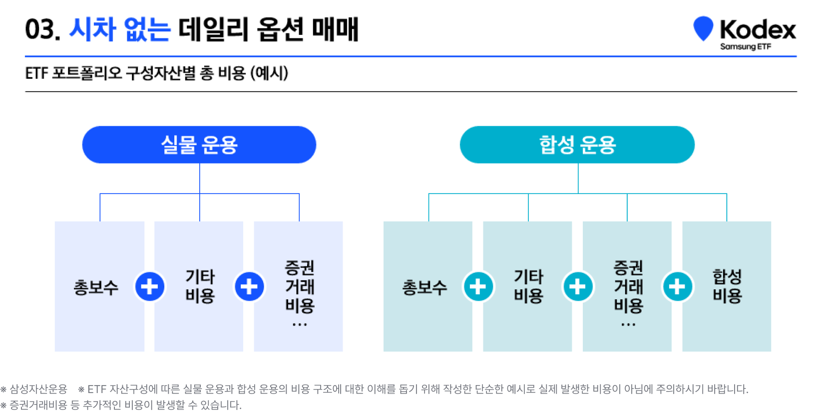 ETF 운용 비용 측면에서도 최소화하여 효율적으로 운용합니다. 위에서 알아본 것처럼, 뉴욕현지법인 위탁을 통해 미국 초단기 옵션을 실물로 운용합니다. 합성 운용의 경우, 기초자산을 매매하지 않고 추적지수 수익률을 수취할 수 있지만, 합성 거래 상대방에게 수수료를 지불하여 운용되기 때문에 추가 비용이 발생합니다. Kodex 미국S&P500데일리커버드콜OTM ETF의 경우 이러한 합성 비용을 제외한 실물 운용을 실시하기 때문에 ETF 운용 비용 절감 효과를 기대할 수 있습니다.
