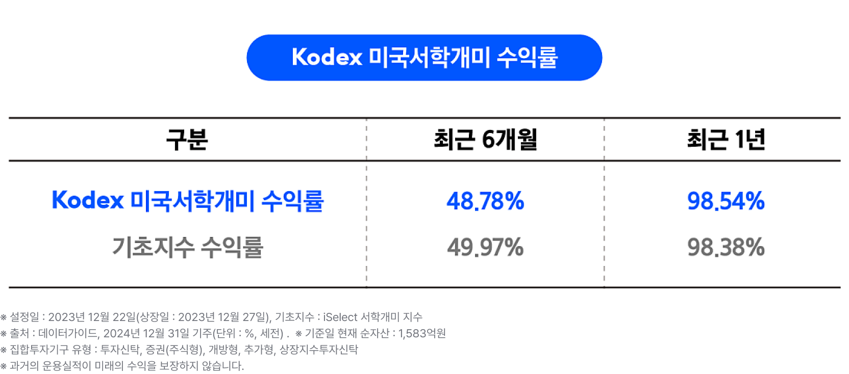 Kodex 미국서학개미 ETF는 엄청난 성과를 내고 있습니다. 그야말로 뛰어난 퍼포먼스를 보이고 있죠. Kodex 미국서학개미 ETF의 수익률은 최근 6개월 기준으로 48.78%, 최근 1년 기준으로 98.54%라는 놀라운 수익률을 보였습니다.