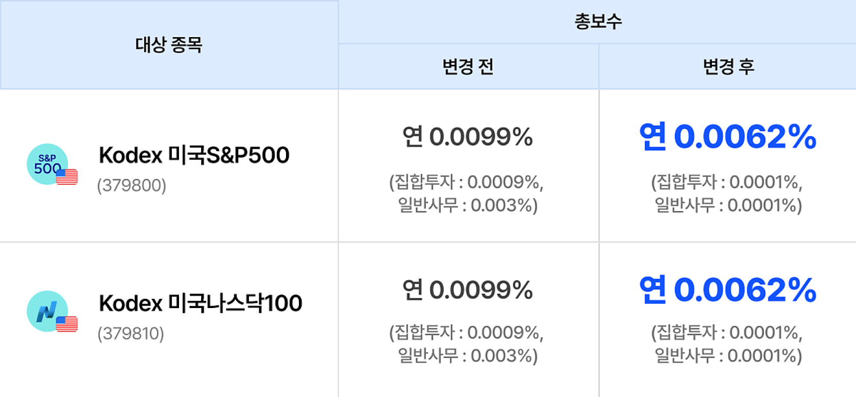 Kodex 미국S&P500 & Kodex 미국나스닥100 ETF의 총보수가 다음과 같이 변경되어 안내 드립니다.