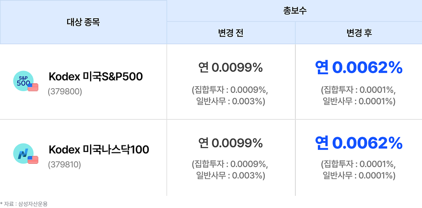 이런 상황에서 Kodex는 투자자들이 장기 투자의 이점을 최대한 누릴 수 있도록, 2월7일 Kodex S&P 500과 나스닥 100 ETF의 총보수를 연 0.0062%로 추가로 인하해 업계 최저* 수준을 보이고 있습니다.