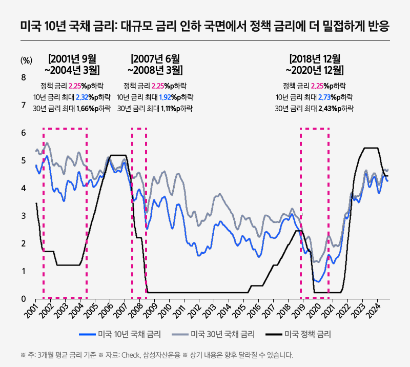특히 정책 금리가 2% 이상 인하되는 국면에서는, 10년 국채 금리가 30년 국채 금리보다 인하 폭을 더 잘 따라가는 경향이 있습니다.