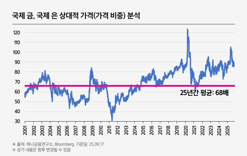 금, 은 평균 가격차이는 얼마나 날까요? 2001년 이후 25년간 금/은 온스당 가격 평균은 68:1로 68배 차이를 보여왔습니다. 1온스당 금 가격÷1온스당 은 가격을 했을 때, 해당 수치가 높을수록 ‘금의 상대적 가격이 높은 상황이다’고 보고 있는데요. 최근에는 금/은 가격이 85배까지 벌어지기도 했습니다. 이는 은이 금에 비해 상대적으로 저평가되어 있다는 신호이자, 은이 금보다 더 큰 성장의 여지가 있다는 신호로도 볼 수 있습니다.