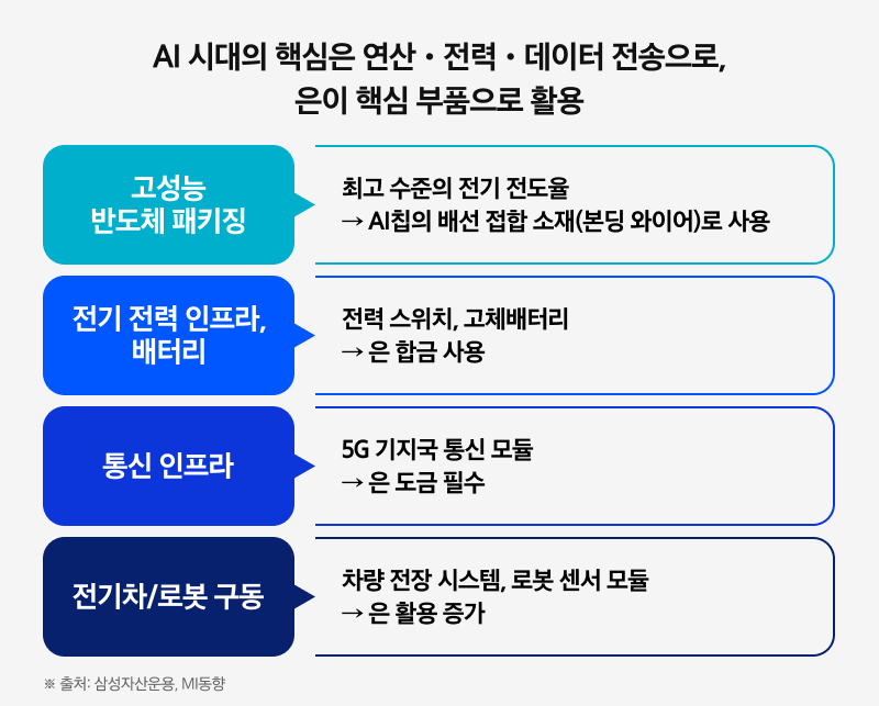 은을 눈여겨보아야 하는 가장 중요한 이유는 바로 산업 수요 급증입니다. 금과 달리 은은 약 60% 이상이 산업용으로 사용되는데요. 뛰어난 전도성과 내구성 덕분에 AI, 전력, 반도체 등 주요 산업에서 빠질 수 없는 필수 소재입니다. 하지만 은은 금처럼 대규모로 채굴되는 금속이 아니기 때문에 공급 탄력성이 매우 낮습니다. 때문에 은 시장은 이미 수요가 공급을 앞서는 구조적 공급 부족 상태가 이어지고 있습니다. 이런 환경은 은 가격 상승 압력을 더욱 강화하는 요인으로 작용하고 있습니다.