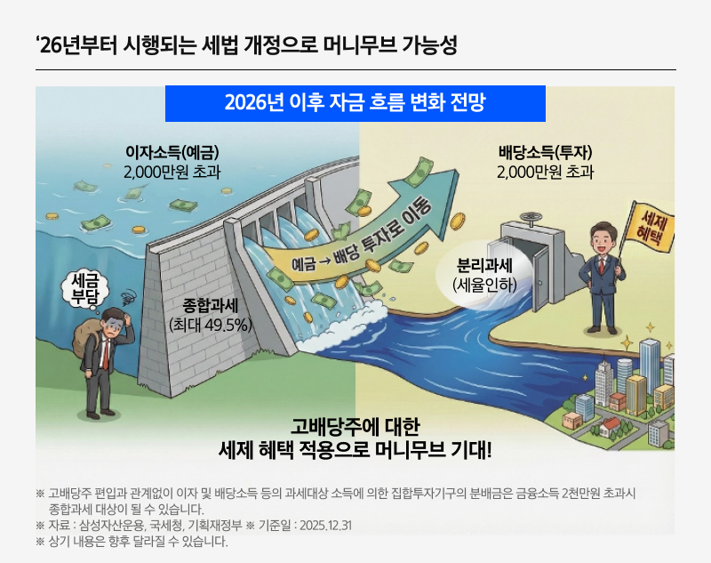 특히 2026년부터 시행되는 세법 개정으로 인해 그동안 예금에 묶여 있던 자산가들의 자금이 증시로 유입되는 이른바 ‘머니무브’가 본격화될 전망입니다. 실제 2024년 통계에 따르면, 2 천만 원 이상의 이자소득 종합소득세 신고자는 약 43만 명으로, 그 규모는 약 14.1조 원*에 달합니다.