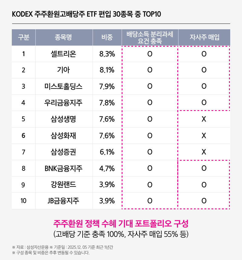 정책 방향에 맞춘 고배당 기업의 새로운 기준을 살펴보면, 우선 전년대비 현금 배당이 감소하지 않은 기업이어야 합니다. 이 조건을 충족하면서 배당성향이 40% 이상이거나, 배당성향이 25% 이상이면서 전년대비 배당을 10% 이상 늘린 기업들이 그 대상입니다. 이러한 정책 기조에 발맞춰 상장된 ‘KODEX 주주환원고배당주 ETF’는 해당 기준을 충족한 기업 가운데 총 주주환원 수익률이 높은 상위 30개 종목을 선정하여 편입하였습니다.