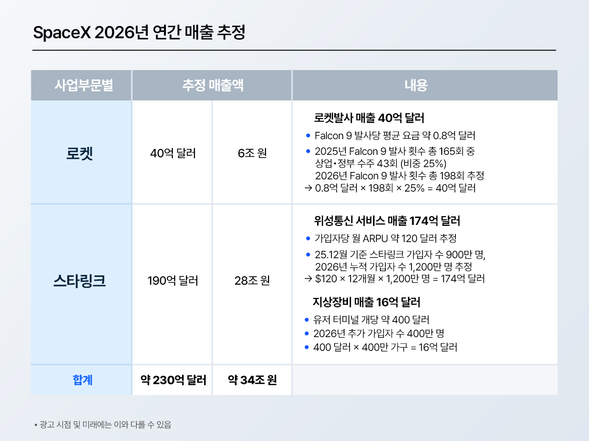 비즈니스 성과도 눈에 띄는데요. 주력 사업인 로켓 발사와 전 지구 대상 상업용 위성 통신망 '스타링크'를 기반으로, 2026년에는 약 34조 원(230억 달러) 규모의 연간 매출을 올릴 것으로 추정됩니다.