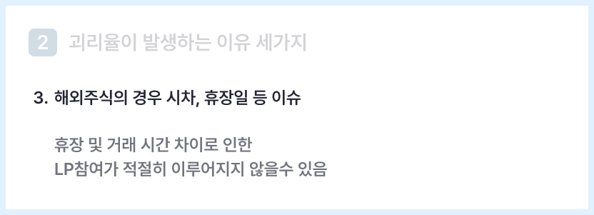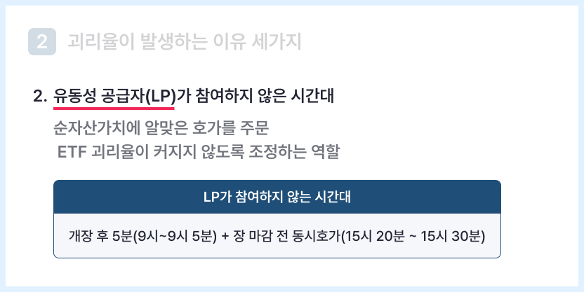 둘째, 유동성 공급자 참여가 없는 시간대에 크게 발생할 수 있습니다. 유동성 공급자(LP, Liquidity Provider)는 ETF의 괴리율이 커지지 않도록 적절한 호가를 주문하는 역할을 말합니다. 오전 9시부터 9시 5분 사이, 오후 15시 20분부터 15시 30분 사이에는 유동성 공급자가 참여하지 않습니다.