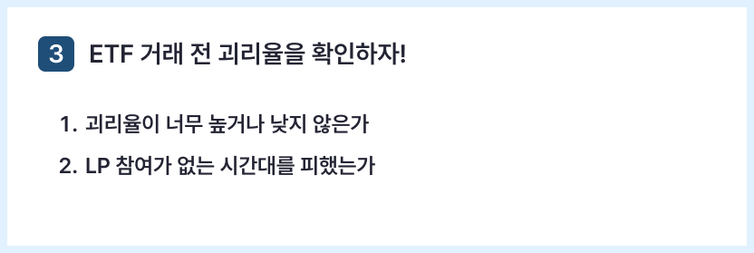 오늘은 ETF의 주요 투자지표인 괴리율에 대해 알아보았습니다. 개념만 알아도 매매할 때 큰 도움이 되는 지표인 만큼, 괴리율을 확인하는 습관을 만들어 봅시다.