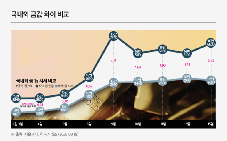 최근 9월에도 국내 개인 투자 자금이 KRX 금 현물 시장으로 몰리면서 KRX 금 현물 가격이 국제 금 가격에 비해 높게 형성되고 있습니다.