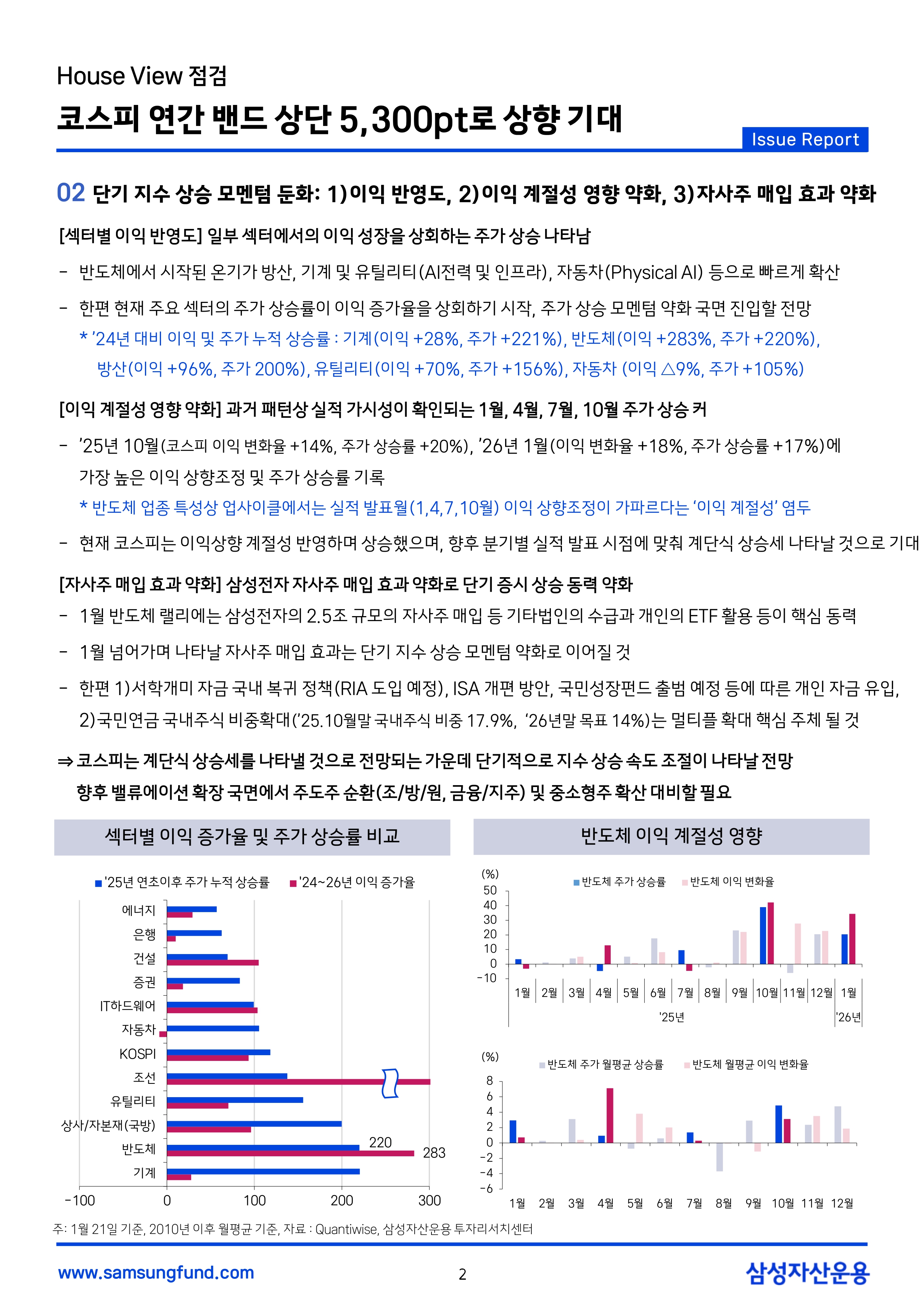 ■ 1차 이익 반영한 코스피, 향후 멀티플 확장 국면 진입 예상되어 밴드 상단 5,300pt로 상향 기대 ■ 반도체에서 시작된 온기가 방산, 기계 및 유틸리티, 자동차 등으로 빠르게 확산 ■ 코스피는 계단식 상승세를 나타낼 것으로 전망되는 가운데 단기적으로 지수 상승 속도 조절이 나타날 전망